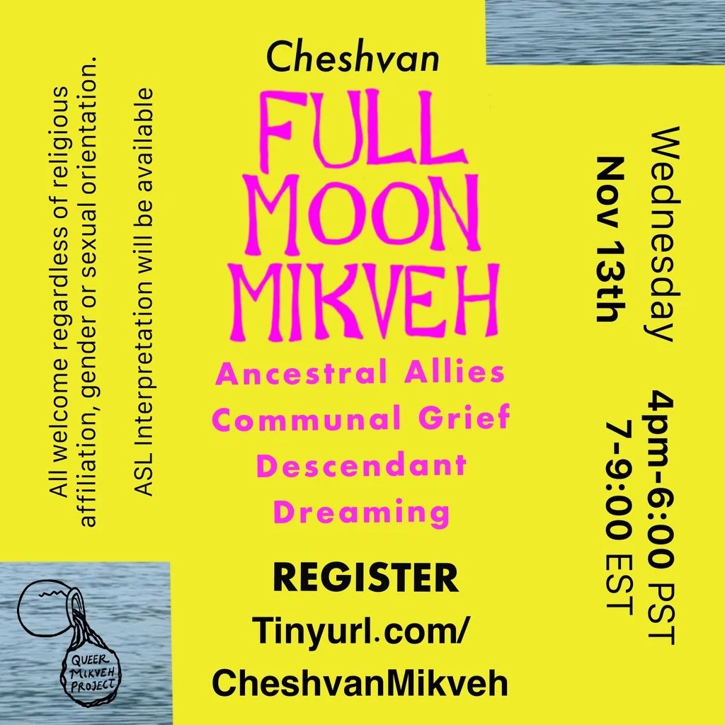 Last month, we experimented with bringing educational elements into our Mikvehs. This month, we return our focus to making ritual together. In our time together, we will hold space for communal grief. We will invite in the support of our ancestors, to support us in processing the tidal waves of grief that are moving through the collective in this time of unending genocide. We will hold spacious time for connection with other queers who desire a Judaism beyond Zionism. We will connect with our descendants and ask what they require of us to move towards a world that embodies collective liberation.