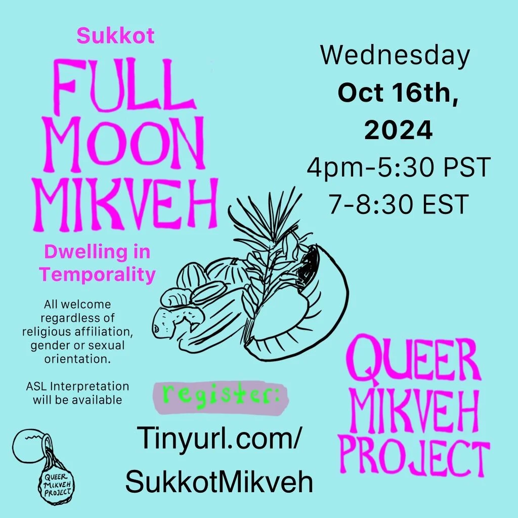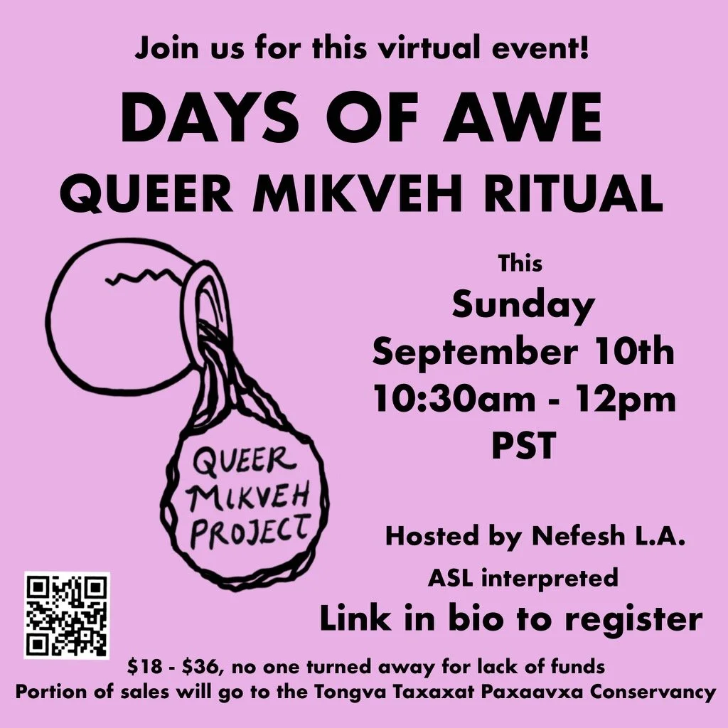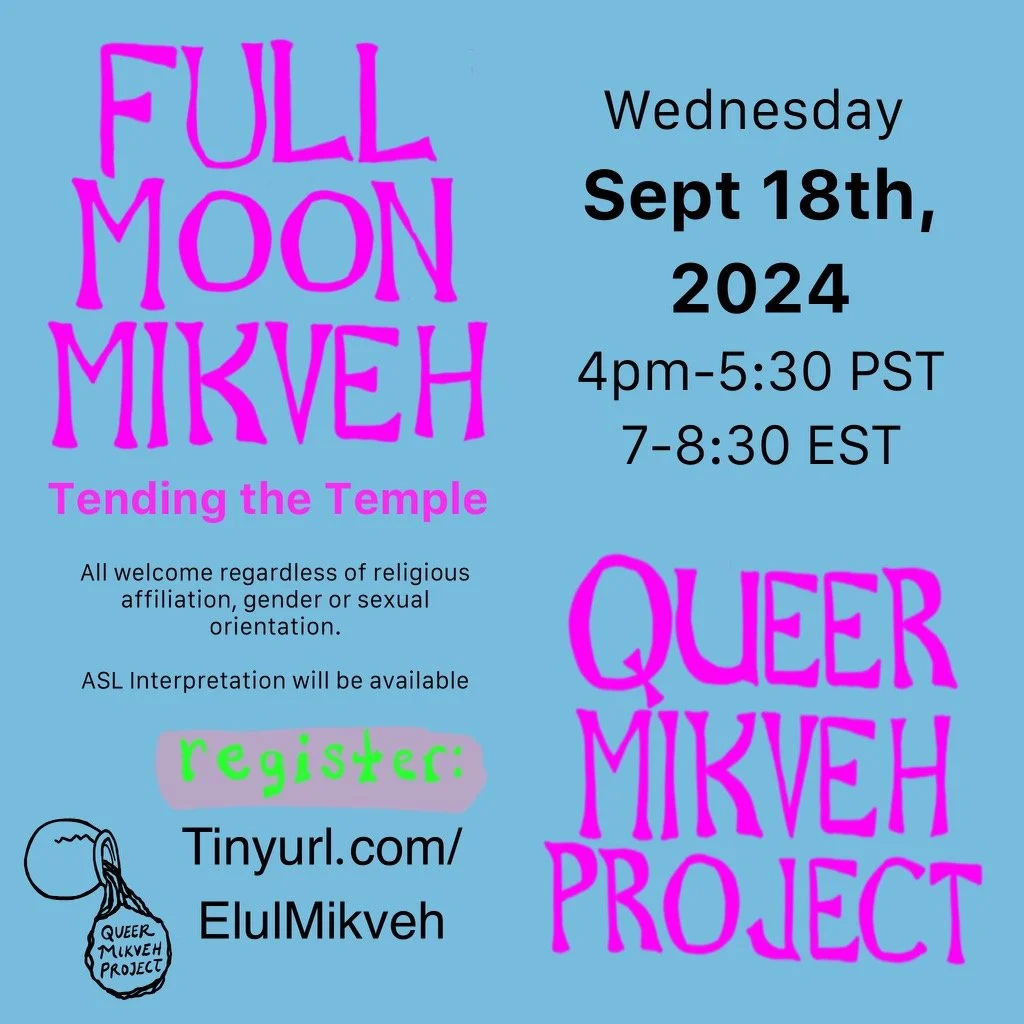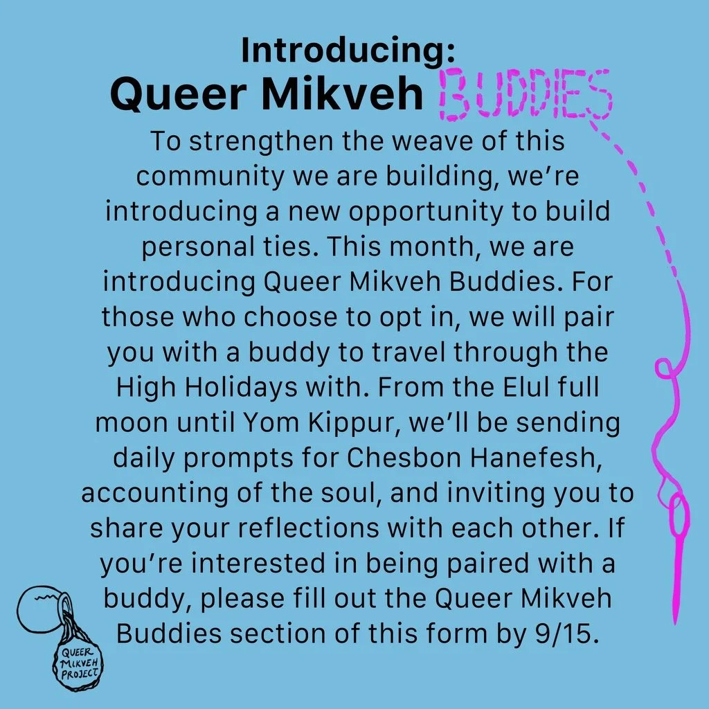 To strengthen the weave of this community we are building, we’re introducing a new opportunity to build personal ties. This month, we are introducing Queer Mikveh Buddies. For those who choose to opt in, we will pair you with a buddy to travel through the High Holidays with. From the Elul full moon until Yom Kippur, we’ll be sending daily prompts for Chesbon Hanefesh, accounting of the soul, and inviting you to share your reflections with each other. If you’re interested in being paired with a buddy, please fill out the Queer Mikveh Buddies section of this form by 9/15.