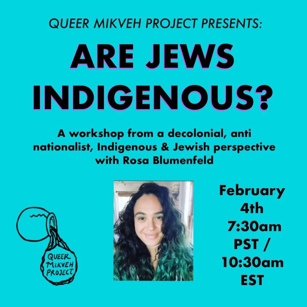 Some questions that Rosa will be addressing: What are nation states for? What is the difference between a historical connection and a current identity? Where do antisemitism and Indigeneity intersect? What are our responsibilities to stand up to this myth as Queer Jews? What about Mizrahi and Palestinian Jews?