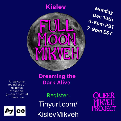 Join Queer Mikveh Project for our monthly Full Moon Mikveh; a monthly virtual gathering to soften, heal, build community and strengthen collective resilience through somatic grounding, creative expression, ritual and connection.