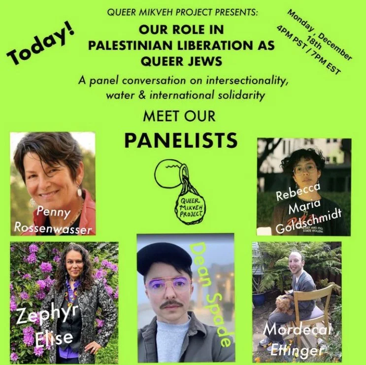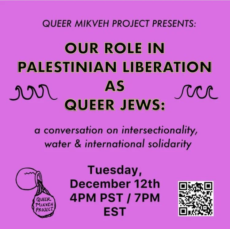 Queer Mikveh Project invites you to a conversation about the ways we as queer Jews are particularly positioned to support Palestinian liberation. We’ll explore and deepen our understanding of the intersections with queer liberation, climate justice and international indigenous solidarity. We’ll focus on the themes of water and how the oceans connect our struggles and give us strength to truth tell and take action for water sovereignty in Palestine. As queers and as Jews, Zionism is enacted doubly in our names. We invite you to join with other anti-Zionist queer Jews to learn, connect and strengthen our capacity to dismantle Zionist myths in our solidarity work.