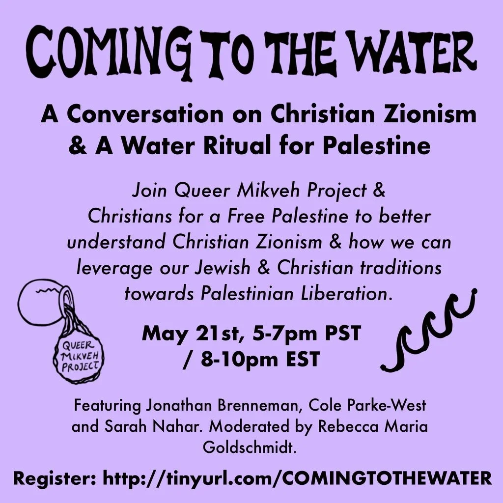 Join Queer Mikveh Project & Christians for a Free Palestine to better understand Christian Zionism & how we can leverage our Jewish & Christian traditions towards Palestinian Liberation.